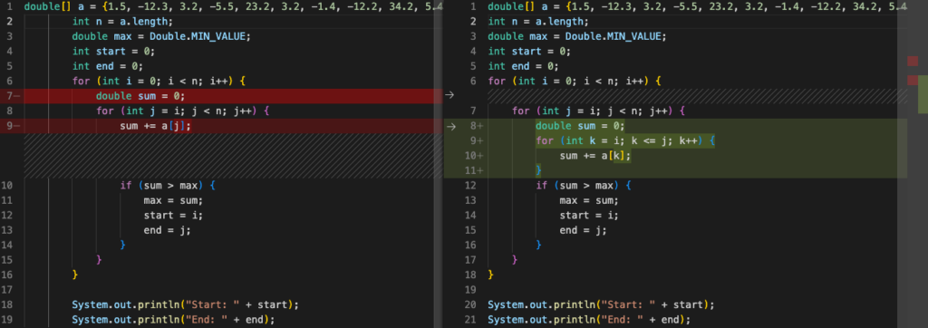 最直接粗暴的方法是利用三重循环,将所有序列一一组合,得到总和最大的区间,按照书中的思路,java代码的实现如下: